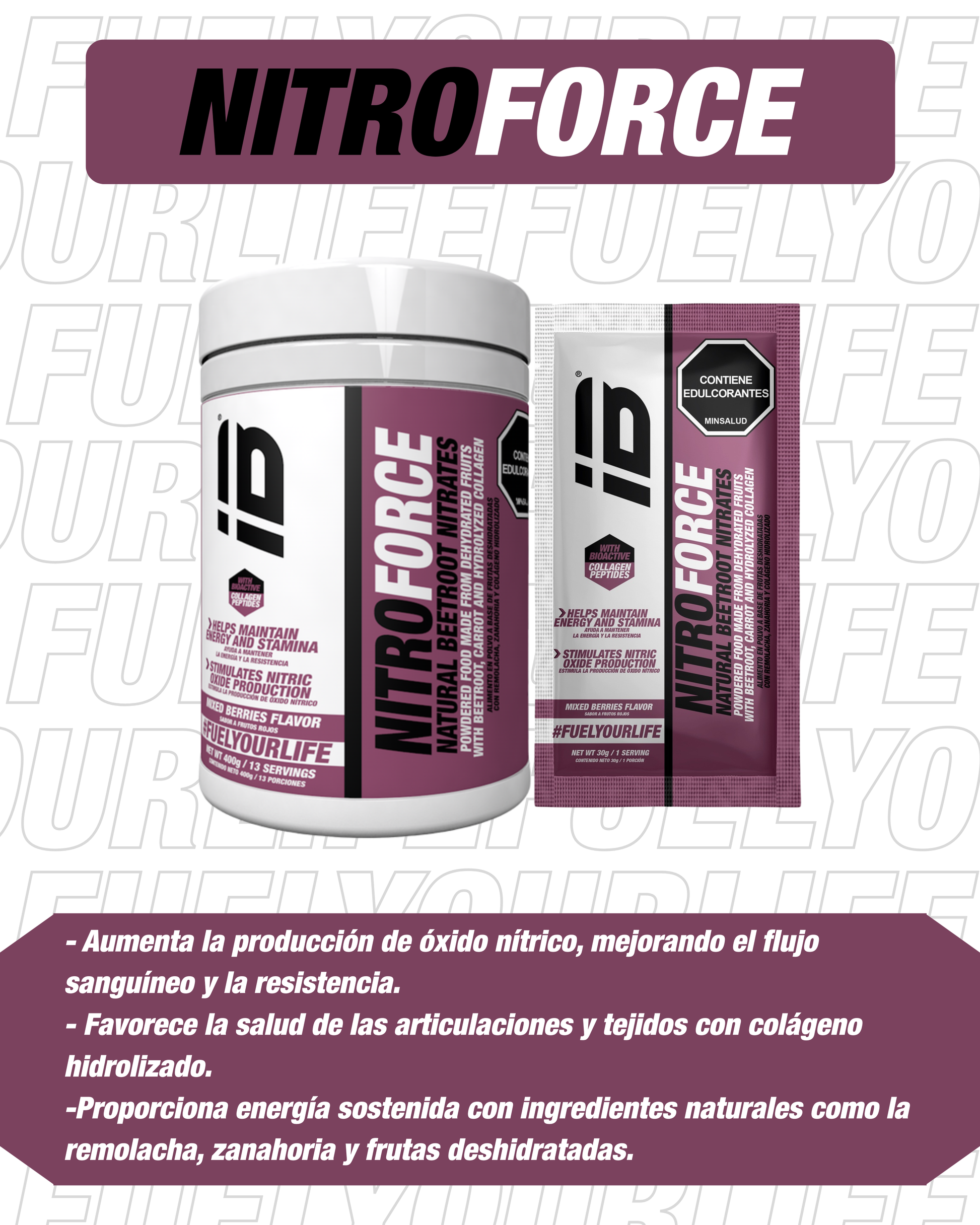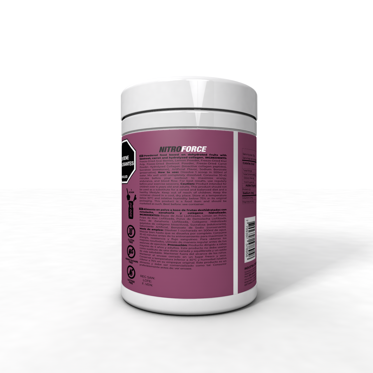 NITROFORCE es una mezcla en polvo avanzada que combina remolacha y zanahoria en polvo, colágeno hidrolizado y frutas deshidratadas. Formulado para deportistas que buscan mejorar su rendimiento, este suplemento ayuda a aumentar la resistencia, optimizar la circulación y promover la salud de las articulaciones, todo con ingredientes naturales y fáciles de digerir.